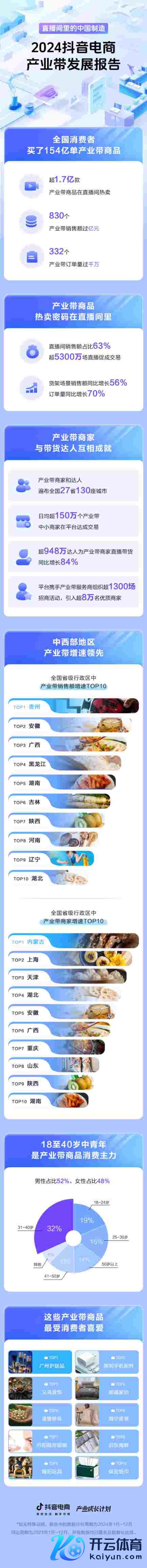 12月31日开云kaiyun体育,抖音电商发布《直播间里的中国制造——2024抖音电商产业带发展申诉》,全面清点2024年寰宇产业带地区实体经济和中小商家在该平台的发展情况。